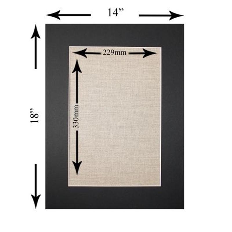 These Rectangular Ready Cut Picture Mounts have a frame size of 18 x 14" (457 x 356mm) and an aperture size of 330 x 229mm. This gives a 63mm border.
