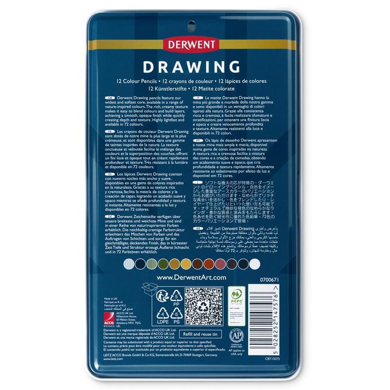 The Derwent Drawing range includes 72 colours in total, available as individual pencils as well as sets of 6, 12, 24, 36 and 72. This 12 tin makes an excellent starting point for building a larger palette or for artists who prefer a carefully selected set of essential drawing colours.