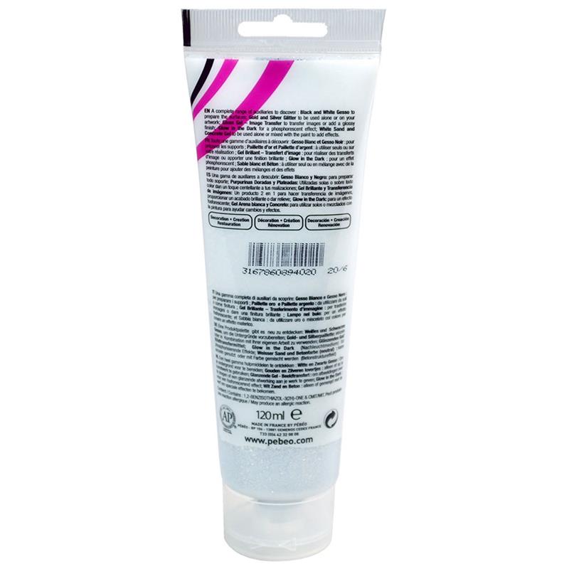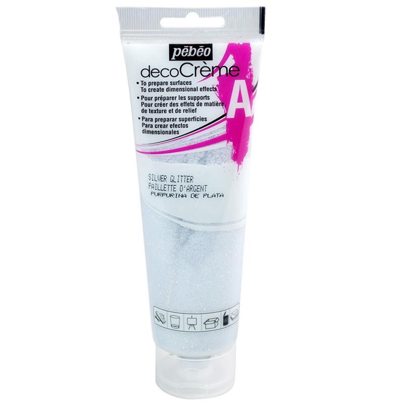 Pebeo Deco Silver Glitter is a water-based silver glitter finishing varnish. Use alone or over your dry acrylic painted surface. Ideal for use with Pebeo Deco or Deco Crème. It dries clear with a fine silver glitter finish. Drying time is 30 minutes touch dry and completely dry in 24 hours. Silver Glitter comes in a 120ml tube which will give you approximately 1.2sq m coverage.