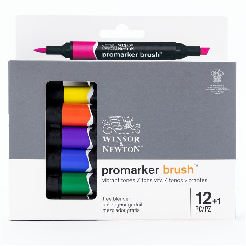 Winsor & Newton Promarker Brush 12 Vibrant Set contains a dynamic selection of bright, high-impact colours plus a colourless blender. Each marker features twin tips — a flexible brush nib for expressive, painterly strokes and a broad chisel nib for smooth coverage and bold design work.