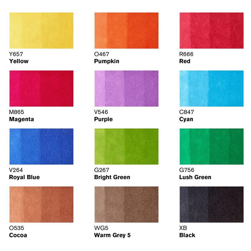 - Colours included: Black, Blender, Bright Green, Cocoa, Cyan, Lush Green, Magenta, Pumpkin, Purple, Red, Royal Blue, Warm Grey 5, Yellow