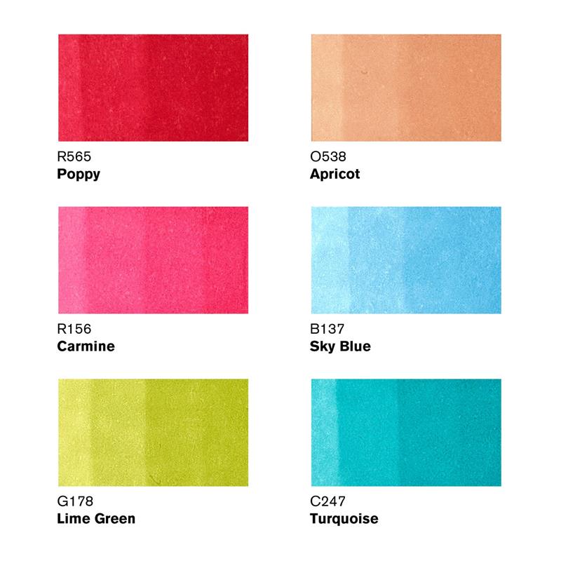 A balanced 6-colour palette offering vibrant mid-range tones and professional control with the flexibility of a brush nib.